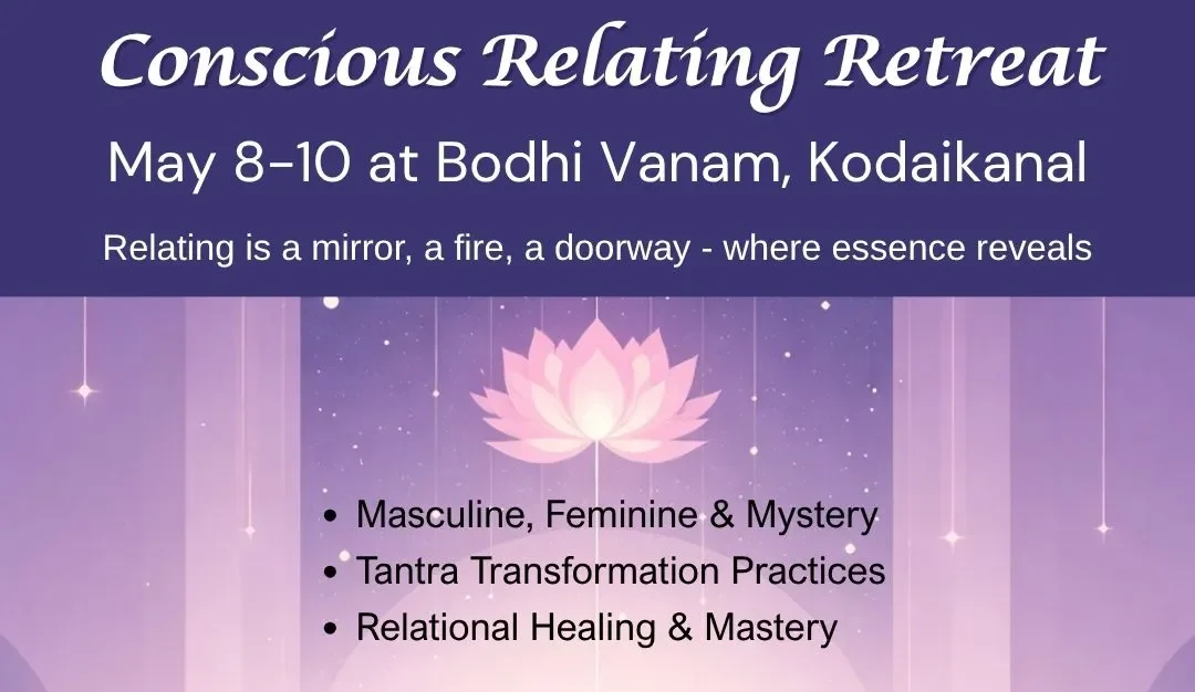 Conscious Relating Retreat Conscious Relating Retreat by Bodhi Vanam Team 4 4 people viewed this event. Register for event To register for this event please visit the following URL: https://forms.gle/xwcrznNzHGBp2aZU9 → Date And Time 2026-05-08 to 2026-05-10 Registration End Date 2026-05-08 Location Bodhi Vanam, Kodaikanal Share With Friends Facebook Twitter Linkedin Xing Pinterest
