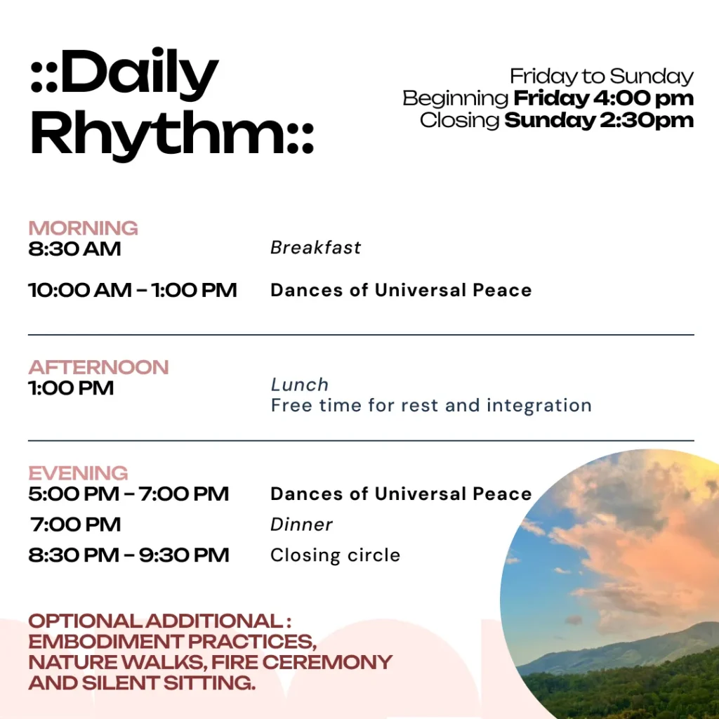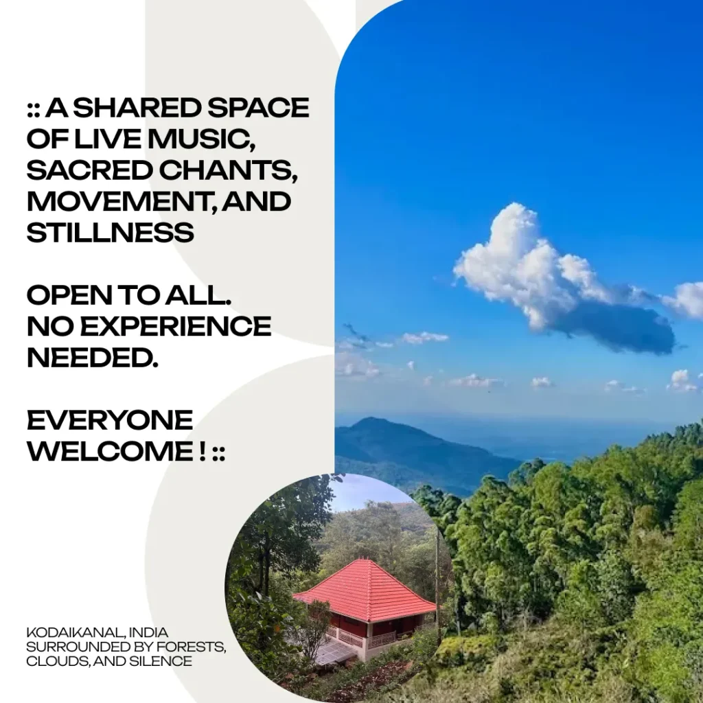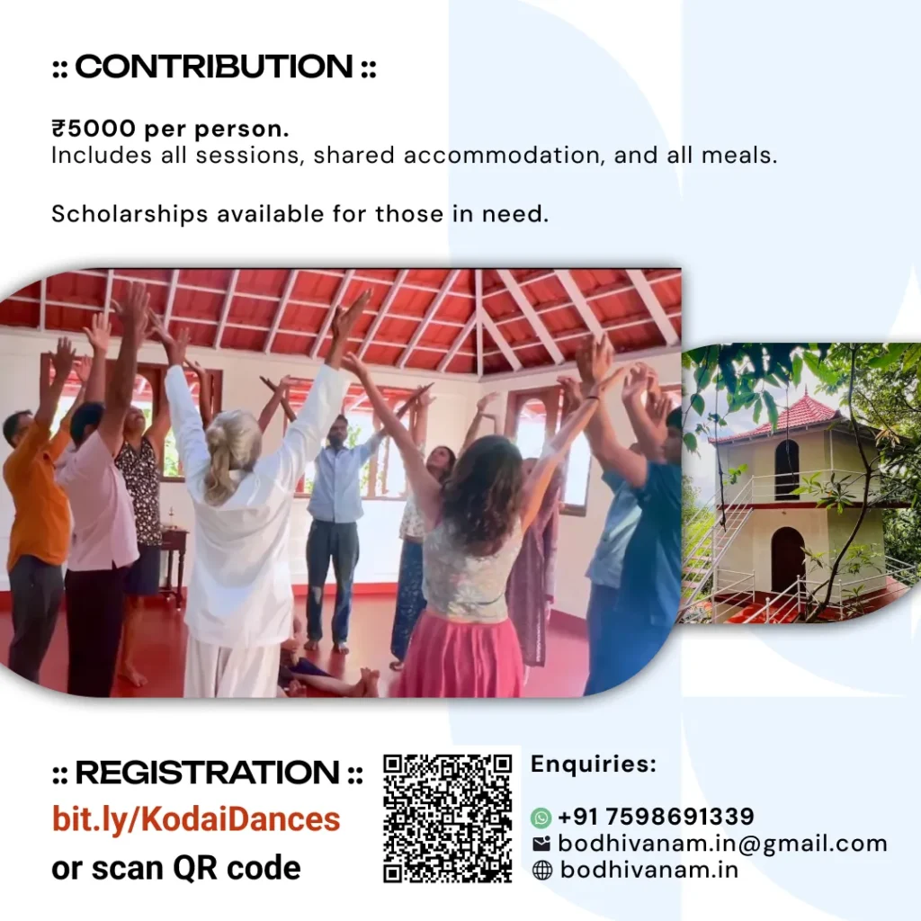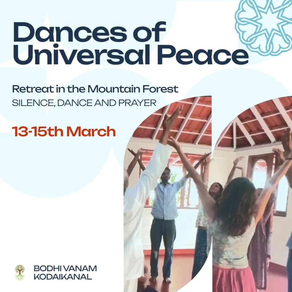 Dances of Universal Peace – Retreat Dances of Universal Peace – Retreat by Bodhi Vanam Team 150 150 people viewed this event. Register for event To register for this event please visit the following URL: https://docs.google.com/forms/d/e/1FAIpQLSfOpEPiGOpUc5-27VbhMsjZfUBjIde9bsePLeh16RIDFCij1g/viewform → Date And Time 2026-03-13 @ 04:00 PM to 2026-03-15 @ 02:30 PM Registration End Date 2026-03-15 Location Bodhi Vanam, Kodaikanal Event Types Transformation Retreat Event Category Retreat Share With Friends Facebook Twitter Linkedin Xing Pinterest